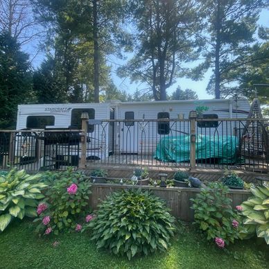 - Includes bedding, kitchen items, garden items, lounger, planters